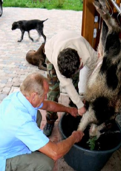 Unter fachmännischer Anleitung wird das Wild aufgebrochen und verarbeitet.